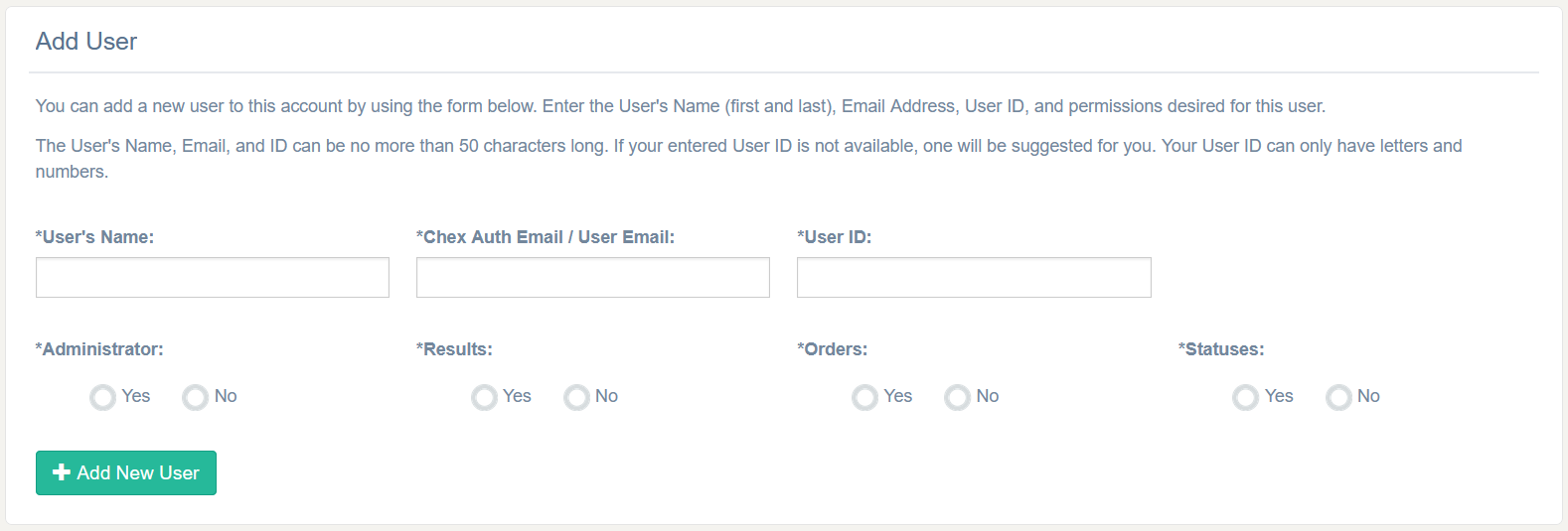 ⚠️ Important: User information must be entered accurately. Once created, user details cannot be edited without assistance from Bchex Client Services.