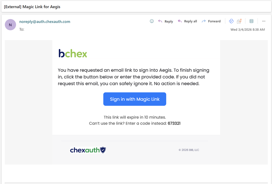 You will receive an email from: noreply@auth.chexauth.com