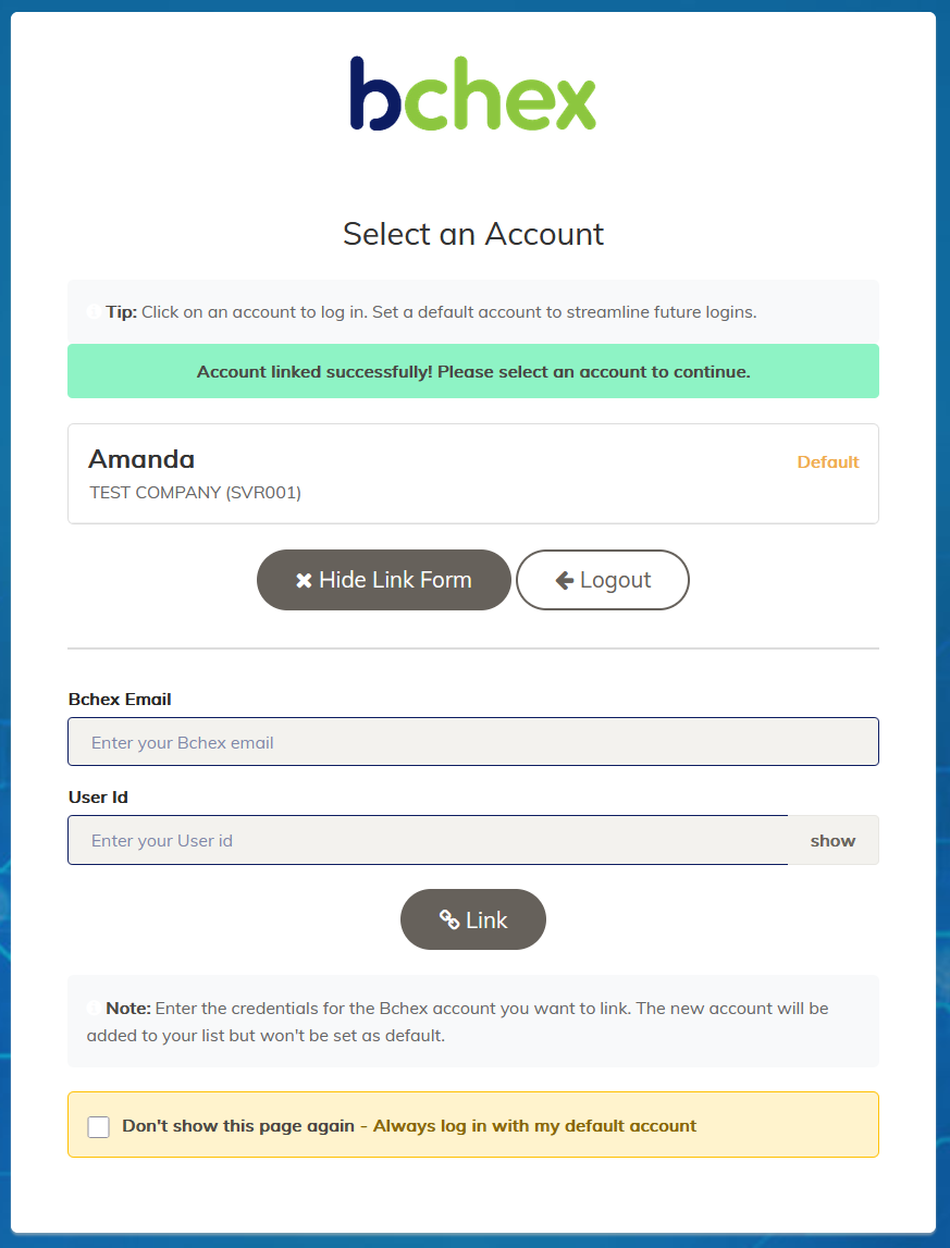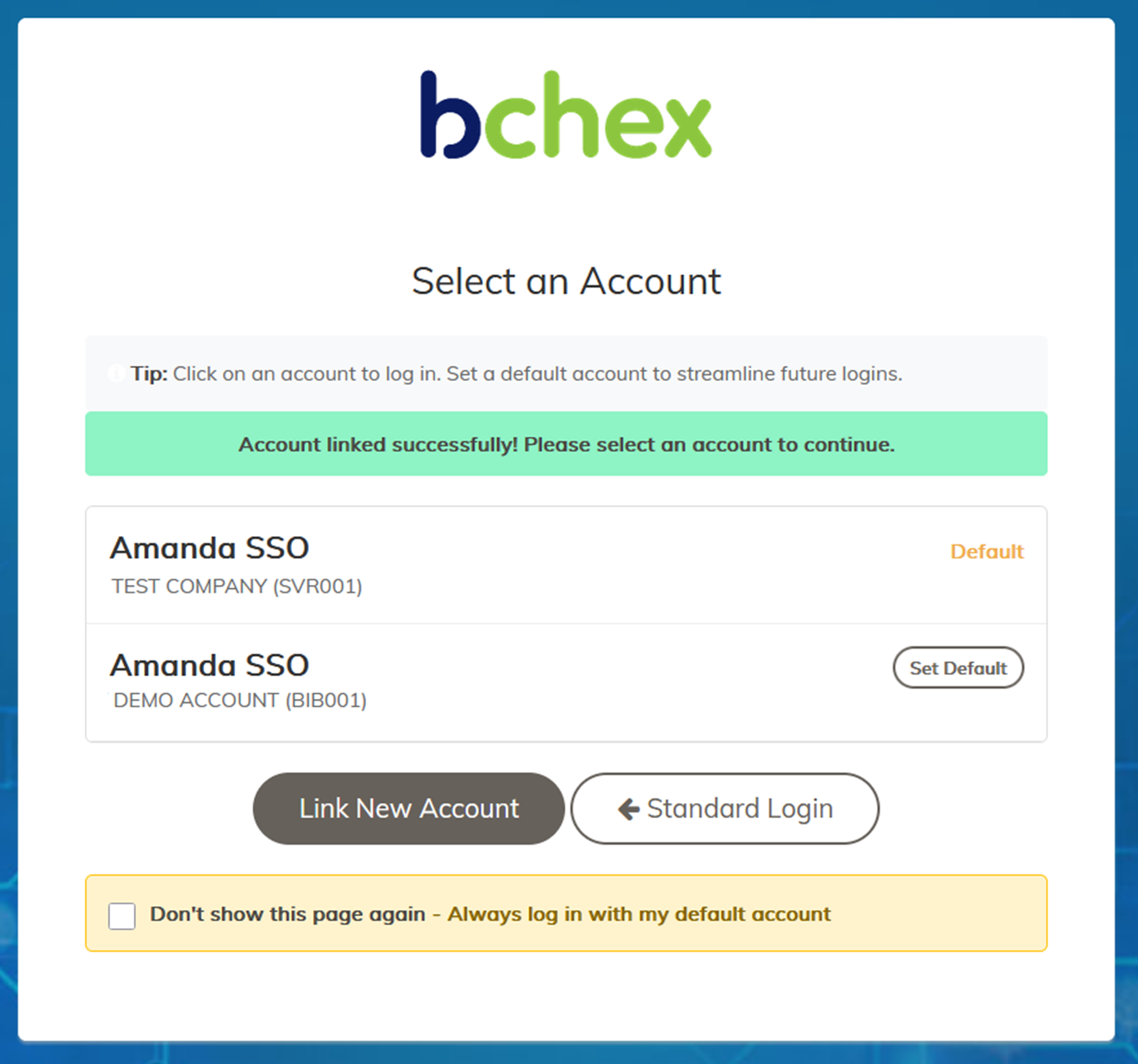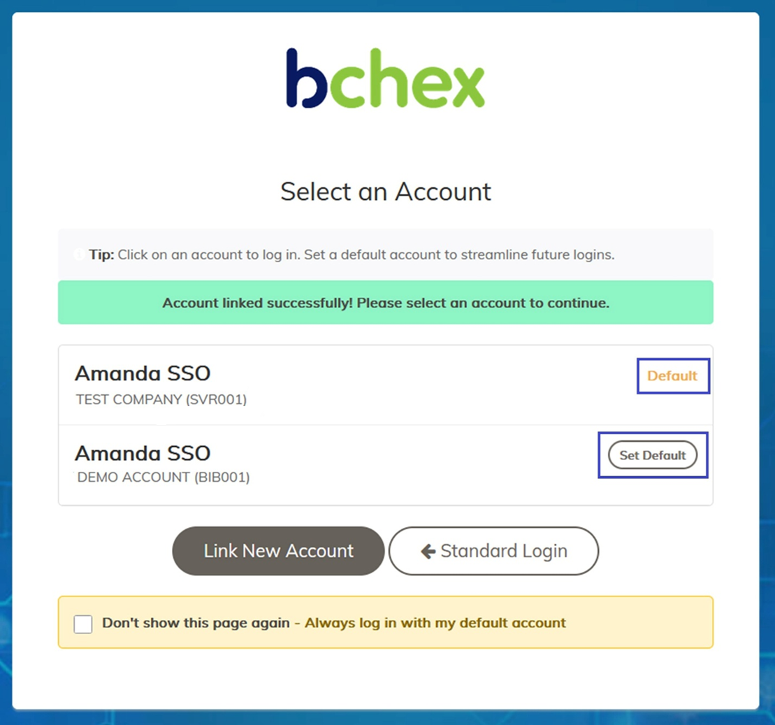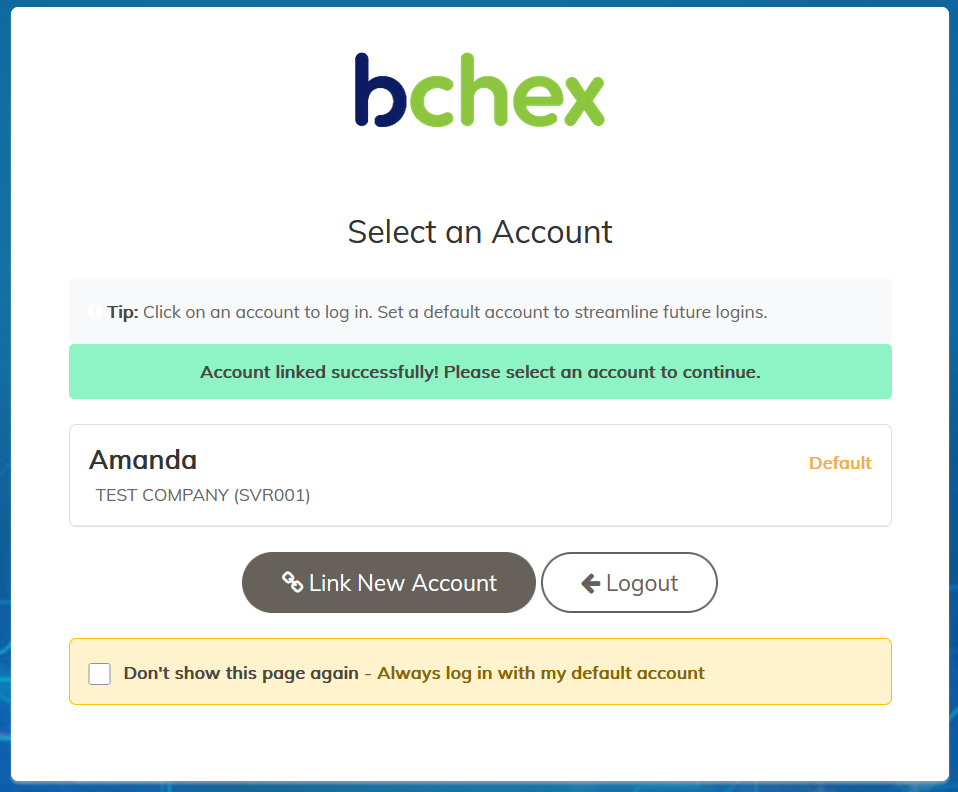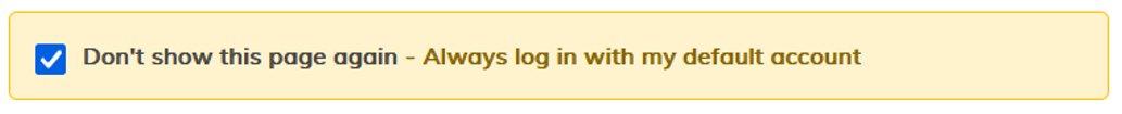 "Don't show this page again – Always log in with my default account" This allows you to skip the account selection screen during future logins. You can change this setting later if needed. | ![]() |