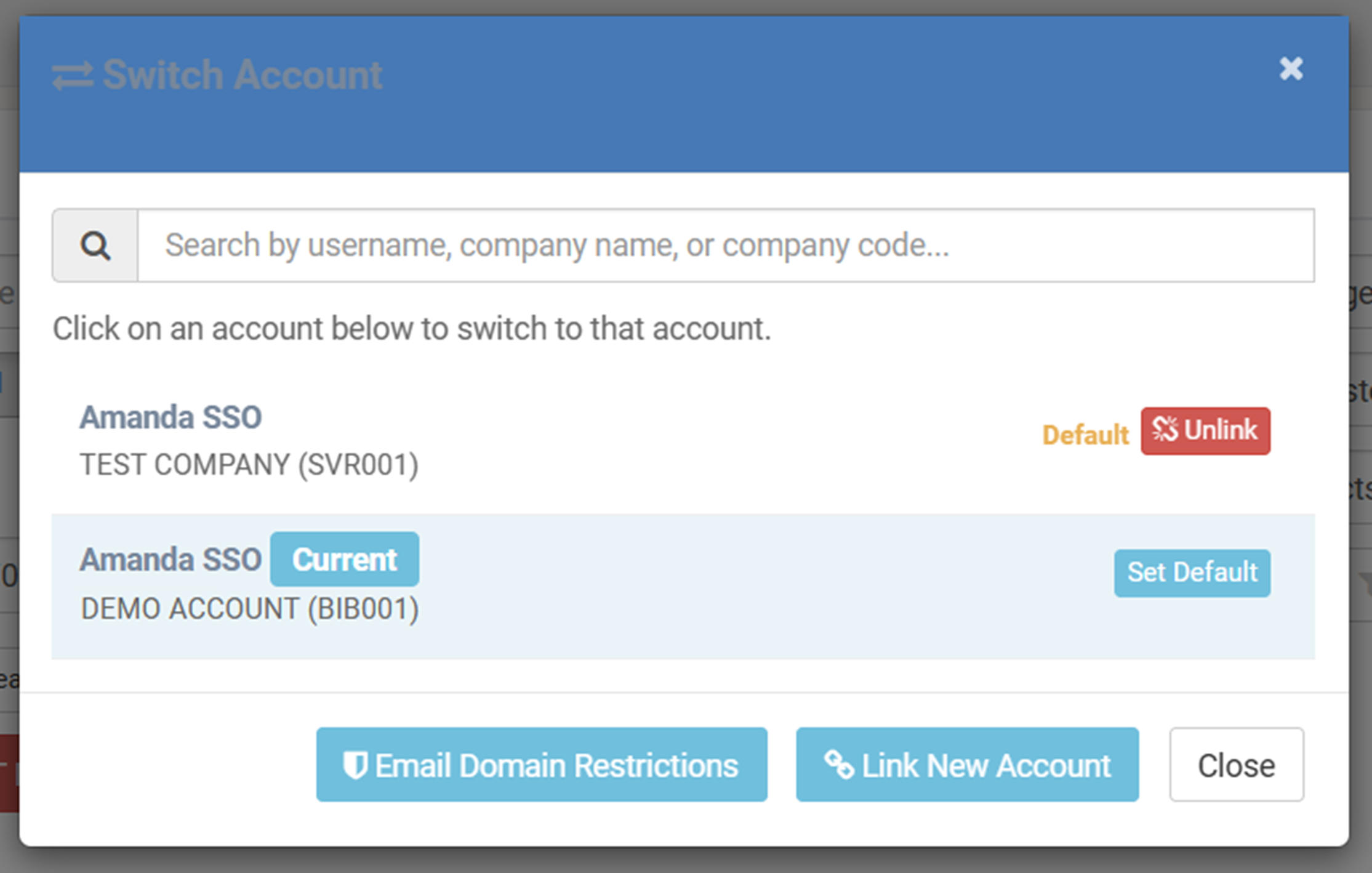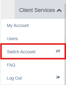 After logging in, you can manage linked accounts by selecting Switch Account from the user menu.