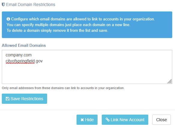 Only email addresses from the listed domains will be able to link to accounts within your organization.