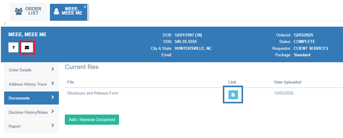 To view a copy of the applicant’s signed authorization form for a completed order: