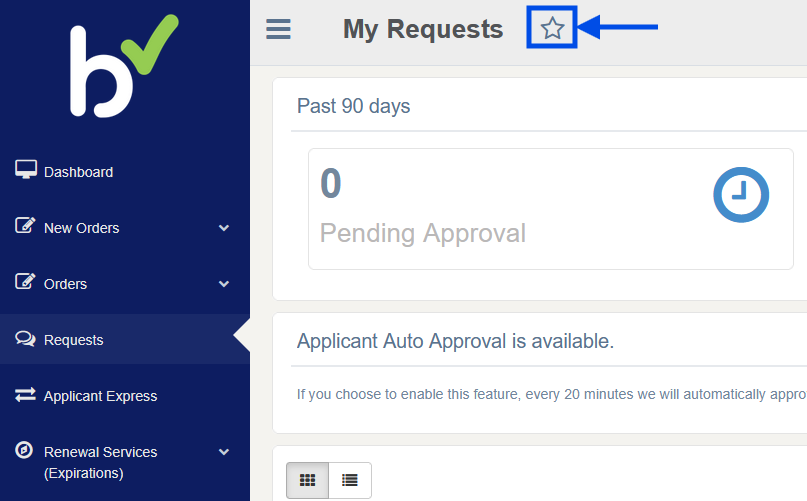 If you frequently navigate to the same page each time you log into Aegis—such as the Requests tab to review pending applications or Background Check Orders to check order statuses—you can set that page as your default start page.