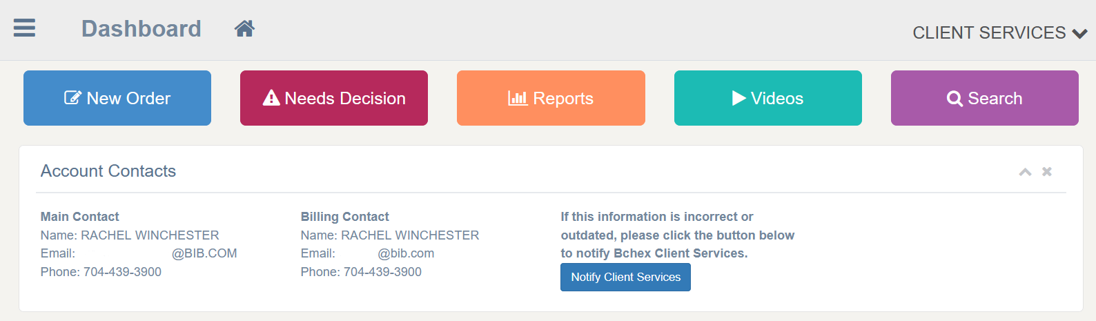 To request updates for the Main or Billing Contact details, simply use the Notify Client Services button. Our team will contact you to verify the changes.