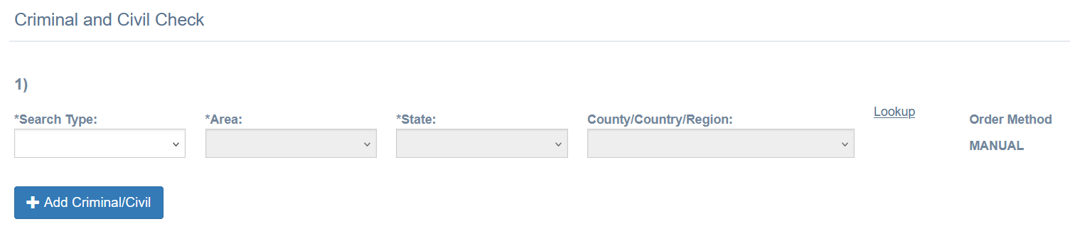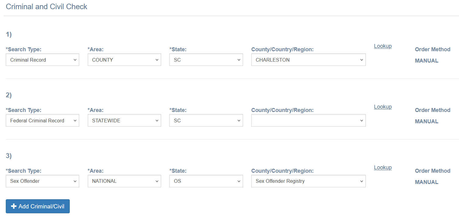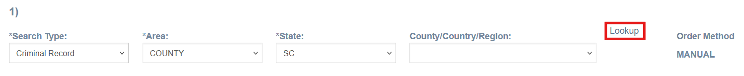 Note: Some search types will automatically populate the remaining fields. For example, selecting the Sex Offender search type will auto-fill the Area, State, and County/Country/Region fields because this search is only available as a Nationwide search.