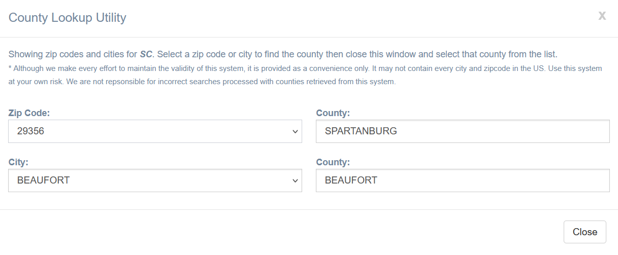 Once you have identified the correct county, simply close the Lookup window and select that county for your search.