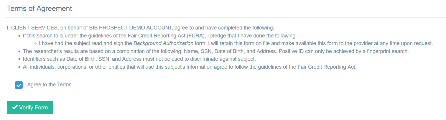 Read and agree to the terms and click Verify Form to move forward in the application.