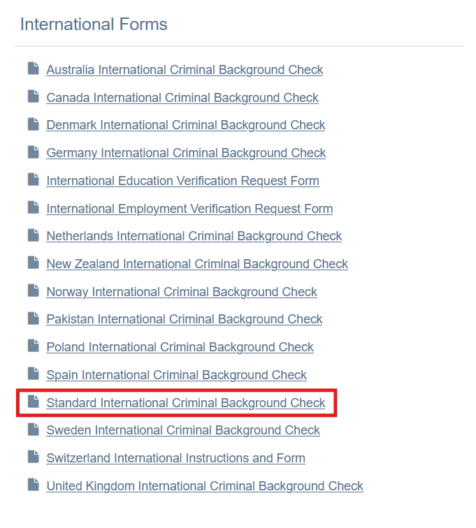 In the second column labeled International Forms, look for the country you need. If the country is not listed, it means that location accepts the Standard International Criminal Background Check form. Download the appropriate form and ensure it is completed in full, along with all required supporting documents.