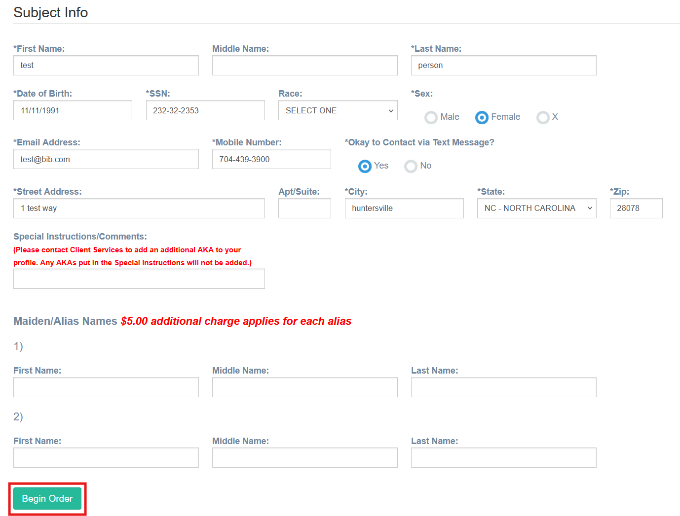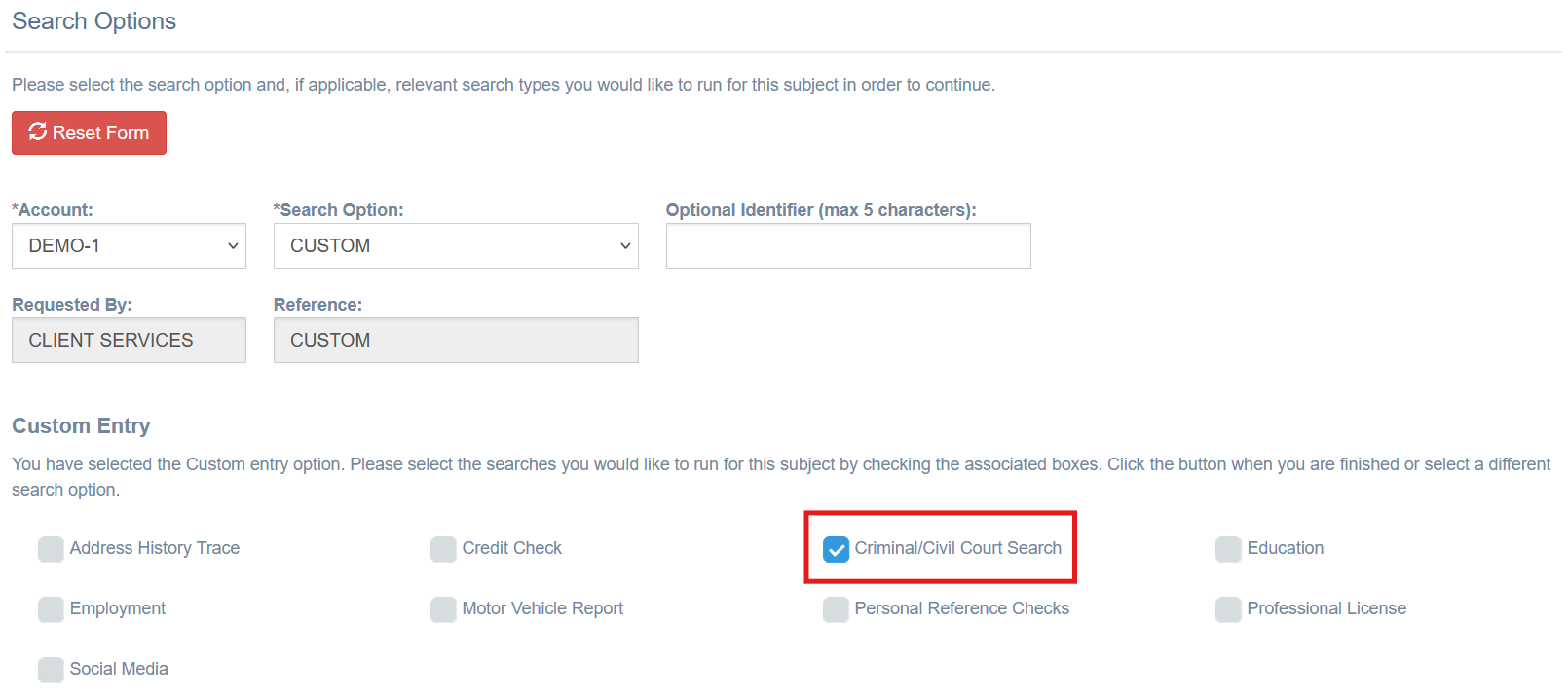 Begin the order in Aegis the same way you would initiate any Custom Order (see full guide here). Select the Custom search option, choose the Criminal/Civil Court Search, and then enter the required Subject Information.