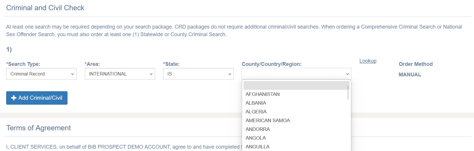 Select the Search Type “Criminal Record” and set the Area to “International.” The State field will automatically update to “IS” to indicate an international search. You can then choose the appropriate country from the dropdown list.